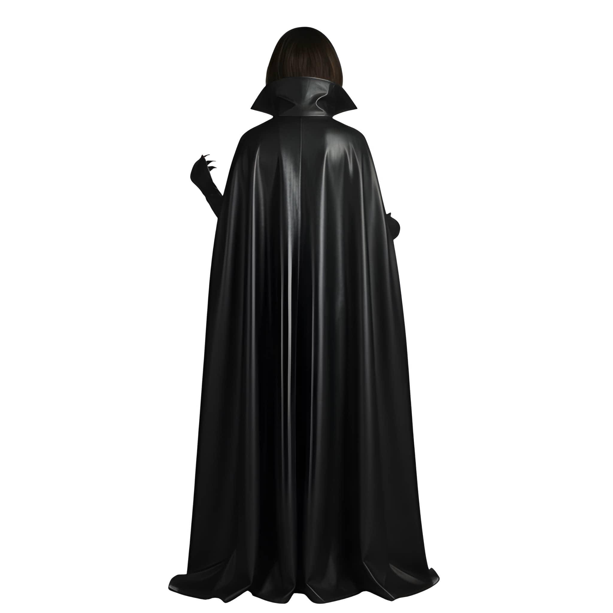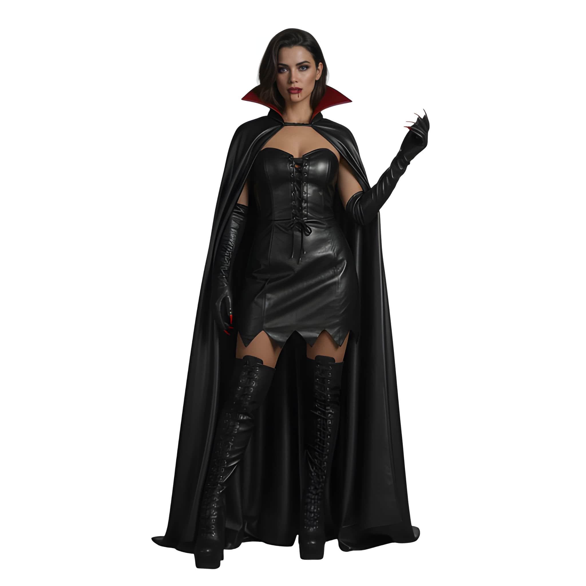 ✔ Structured Black Leather Corset Dress ✔ Premium Long Leather Gloves ✔ Dramatic High-Collar Hooded Cloak ✔ Statement Vampire Silhouette
