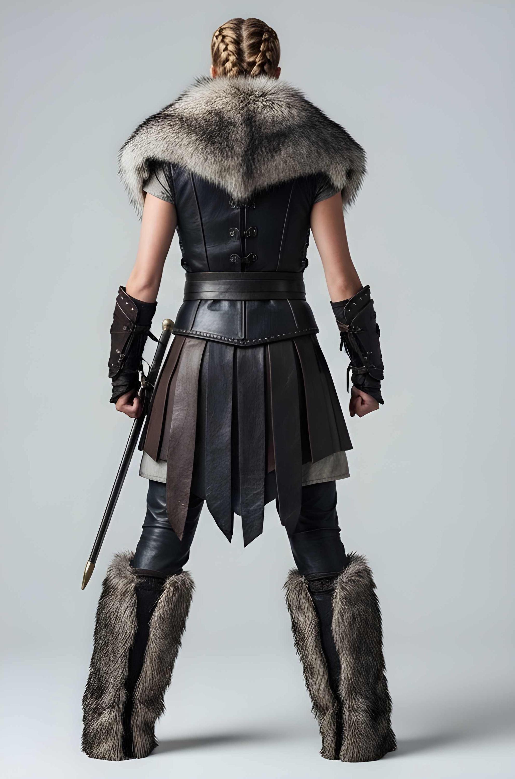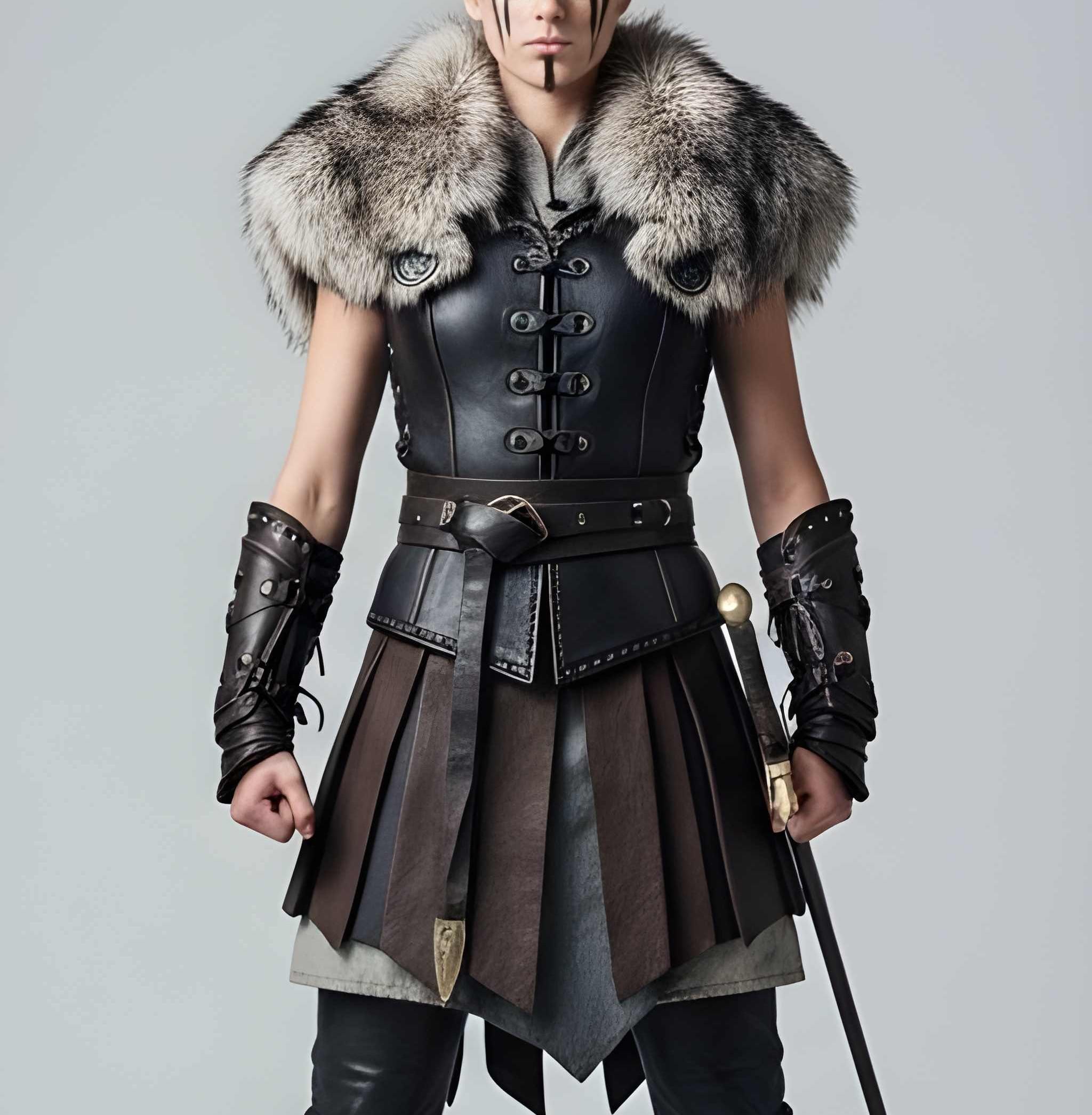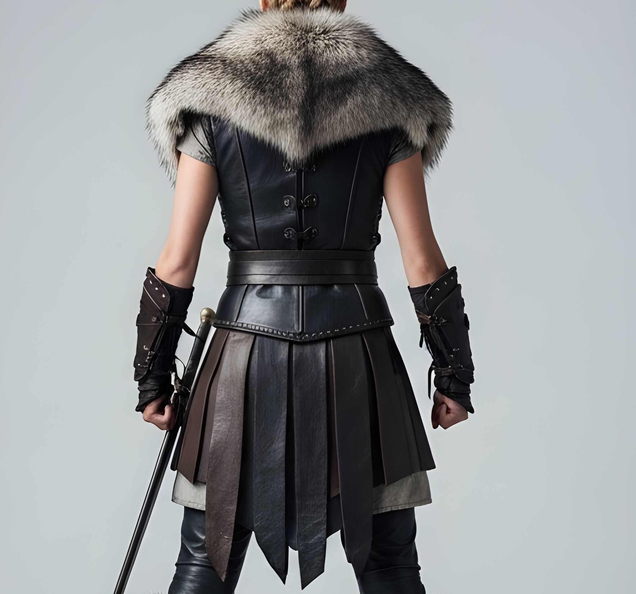 ✔ Premium genuine leather construction ✔ Structured warrior bodice for powerful silhouette ✔ Dramatic fur shoulders for commanding presence ✔ Battle-inspired skirt panels for mobility ✔ Reinforced belt for shape and support ✔ Matching arm guards for authentic warrior styling