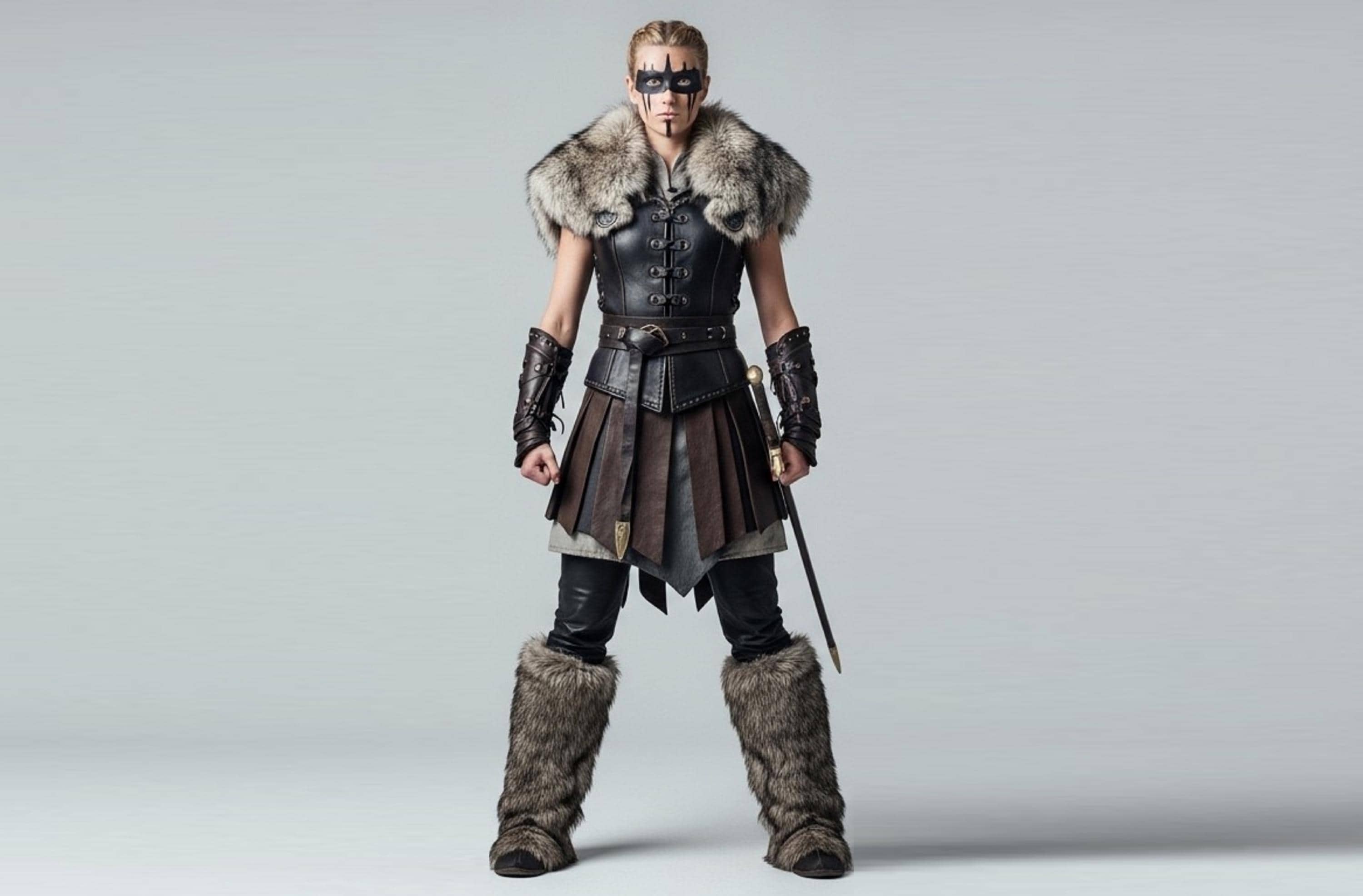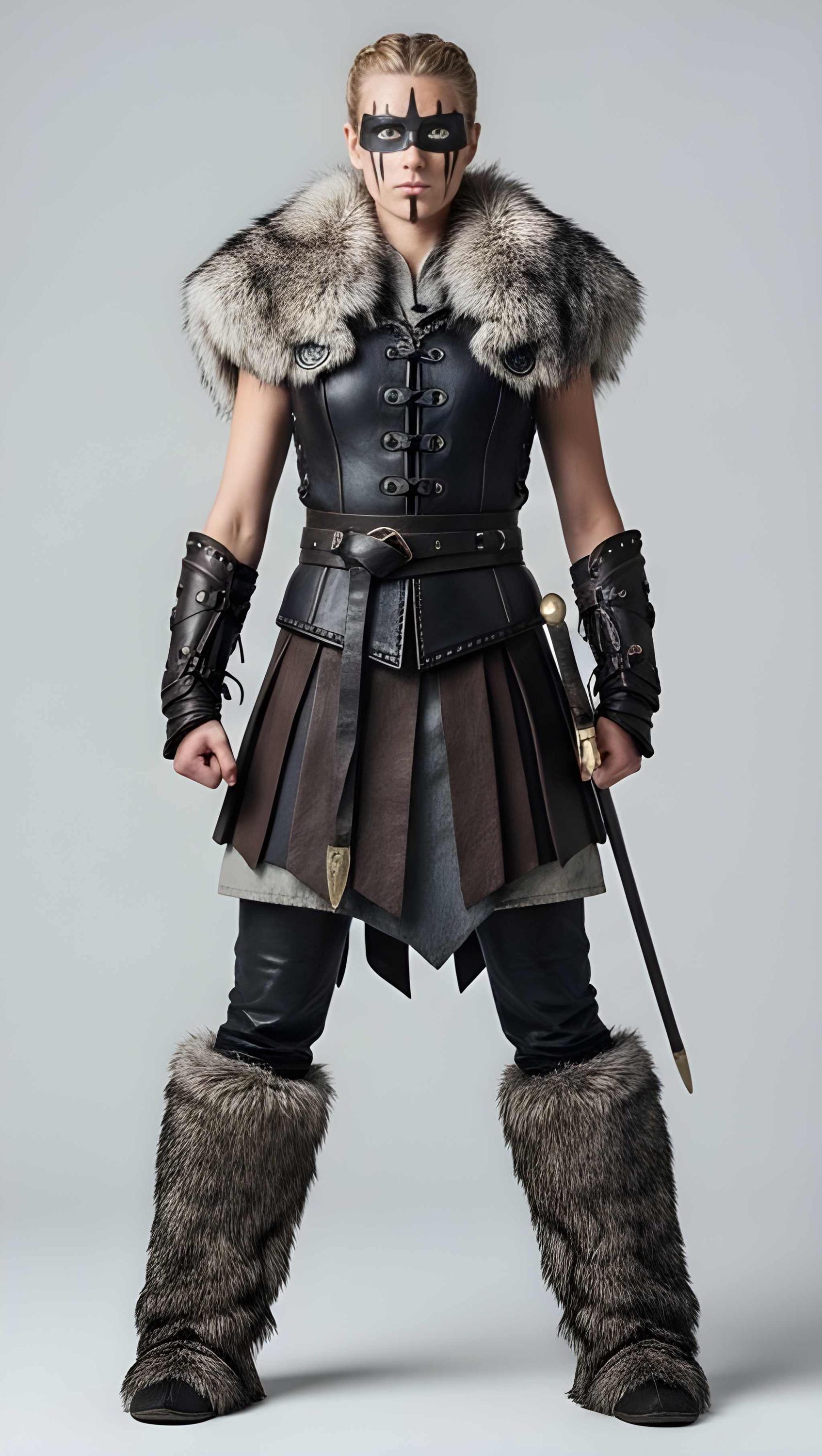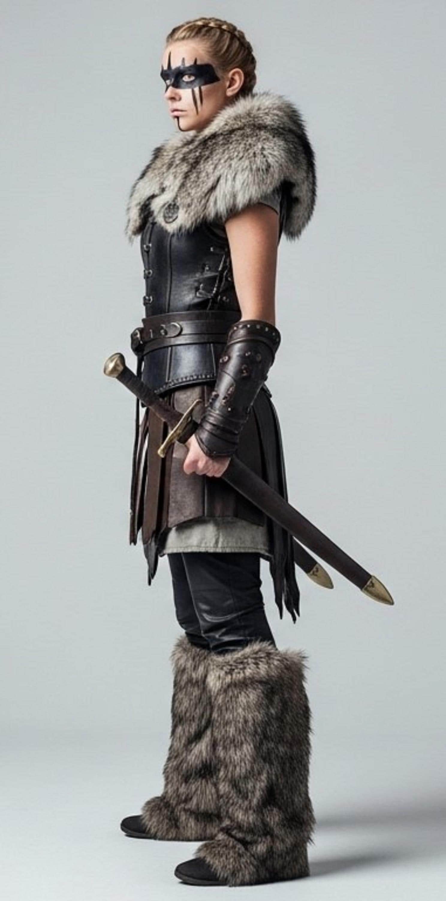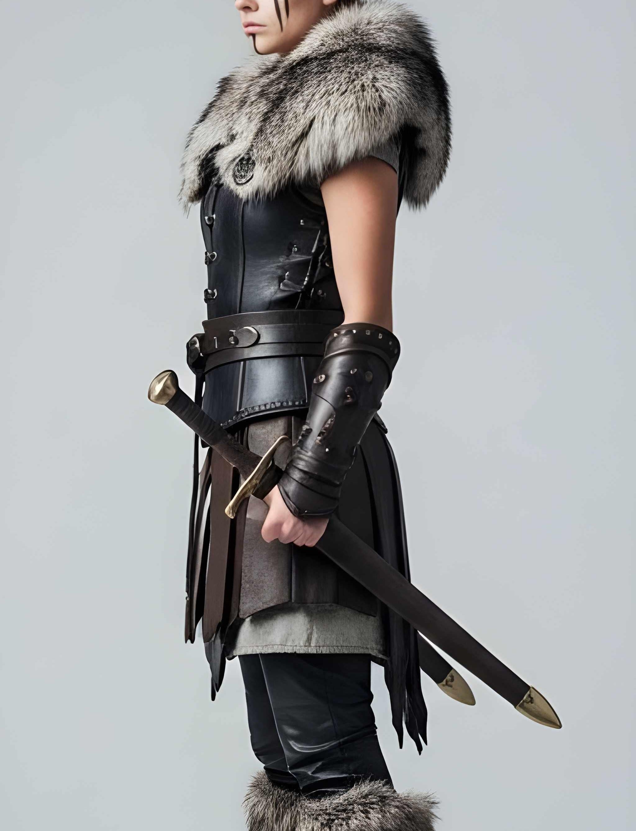 ✔ Premium genuine leather construction ✔ Structured warrior bodice for powerful silhouette ✔ Dramatic fur shoulders for commanding presence ✔ Battle-inspired skirt panels for mobility ✔ Reinforced belt for shape and support ✔ Matching arm guards for authentic warrior styling