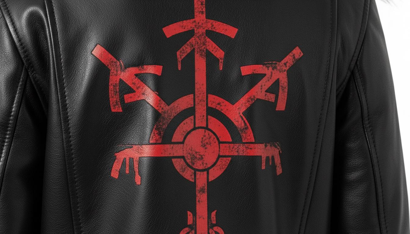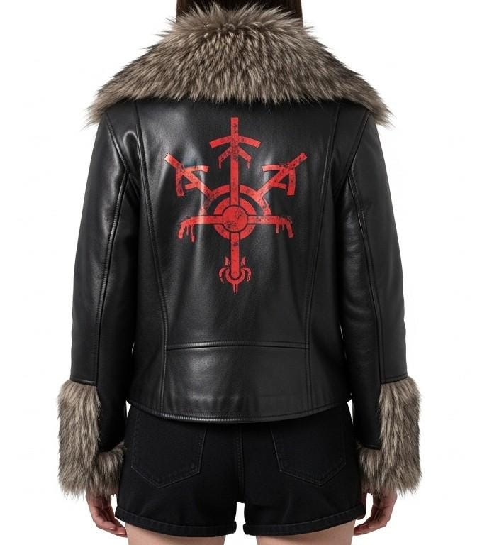 The deep black leather symbolizes strength. The fur projects status. The crimson rune artwork radiates danger.